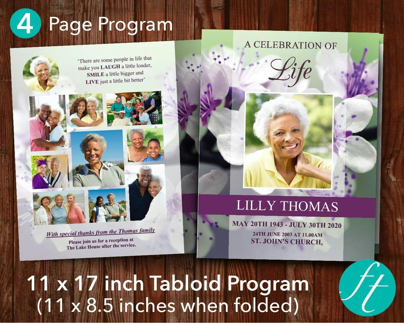 4 Page Purple Blossom Funeral Program Template (11 x 17 inches)