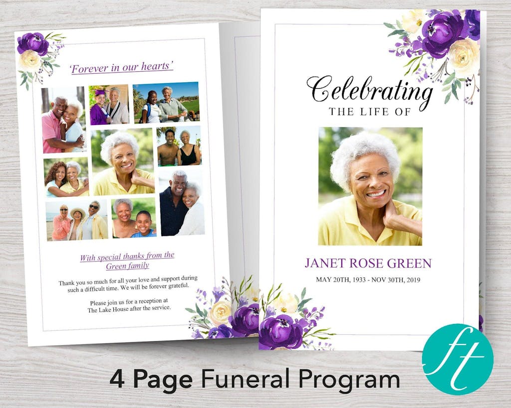 4-Page Funeral Program Template with purple and cream watercolor flowers and a photo collage. Instant download, easy to edit in Microsoft Word and print at home or local print shop. Includes space to add single photos, an obituary, an order of service (or any additional text like a poem) and a photo collage.