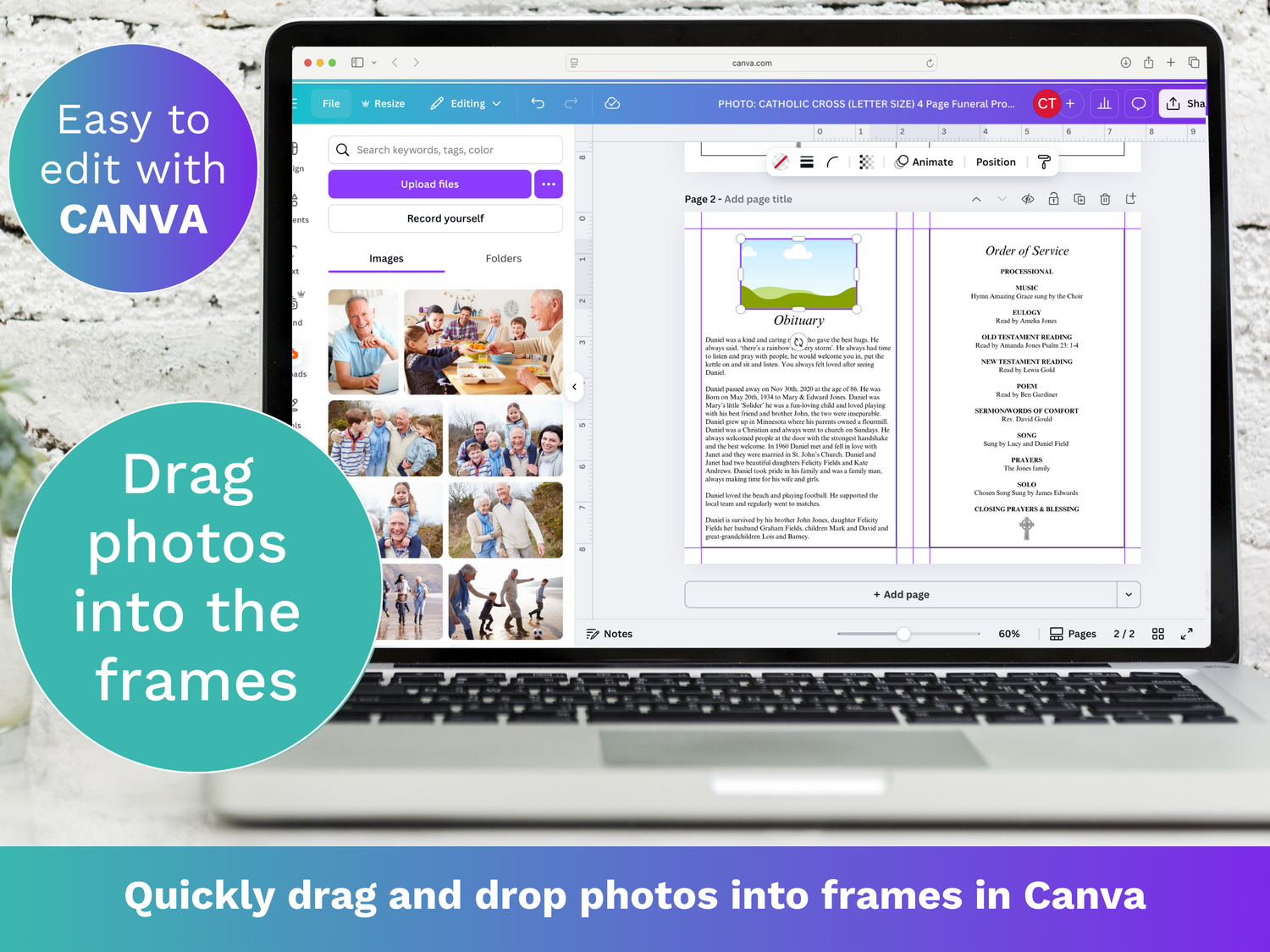 Simply upload your photos to Canva by clicking the Upload button and selecting the photos from your device. Then drag and drop your photos into the collage templates and adjust the size and position if needed. Edit text, fonts and adjust background and font colors to create a beautiful and personalized tribute.