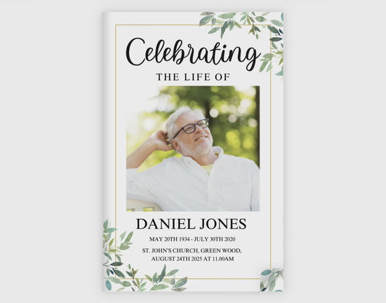 This template is fully customizable in Canva with space for photos, an obituary, poems, scriptures, tributes, and other cherished details that honor a life beautifully lived. The gentle green leaf artwork provides a natural, calming backdrop, creating a heartfelt keepsake that family and friends will treasure.