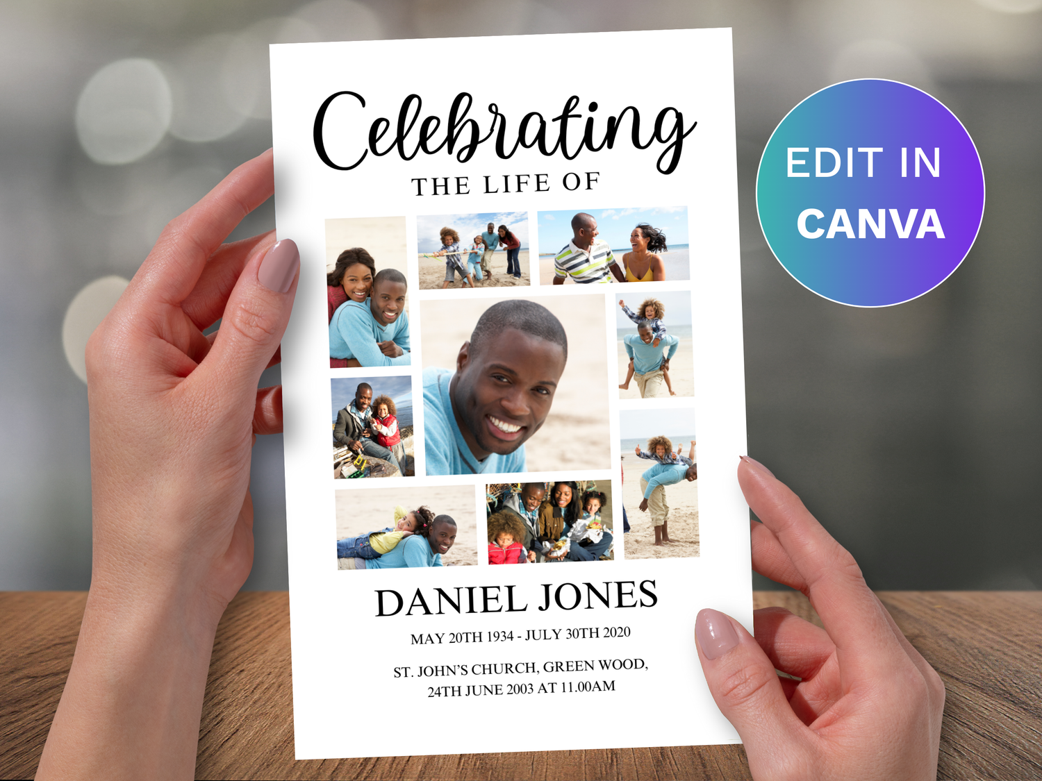 Celebrate the life and memories of your loved one with this 4-page Canva funeral program template, featuring a beautiful photo collage on the front page. Created to highlight cherished moments, this template allows you to showcase multiple photos alongside an obituary, poems, scriptures, tributes, and other meaningful details. Fully customizable in Canva, it provides the flexibility to create a personal and heartfelt keepsake. The collage-style layout offers a touching way to share memories, making it a treasured tribute for family and friends