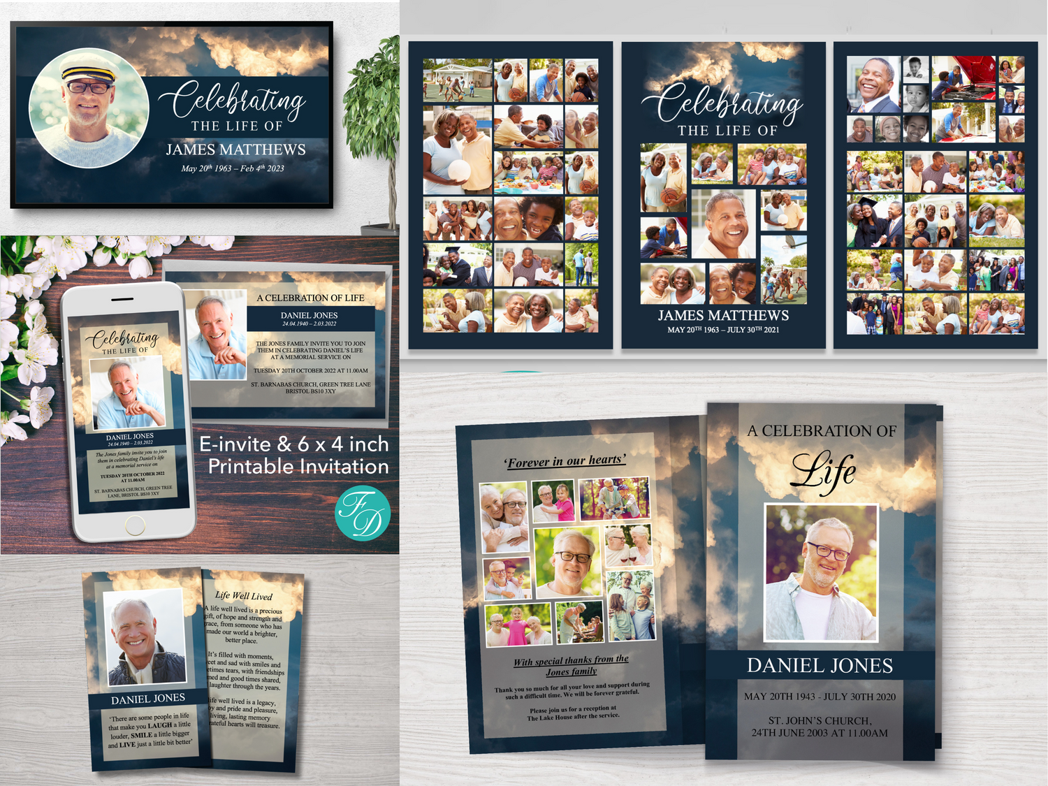Create a beautiful, coordinated memorial with this editable funeral program & service template set. Includes: Sky themed 4-page Funeral Program, Photo Display, Premium Slideshow, digital & print Invites and Prayer Card. Easy to edit in Microsoft Word or PowerPoint. Perfect for a funeral, memorial service, or celebration of life. Print at home or professionally.
