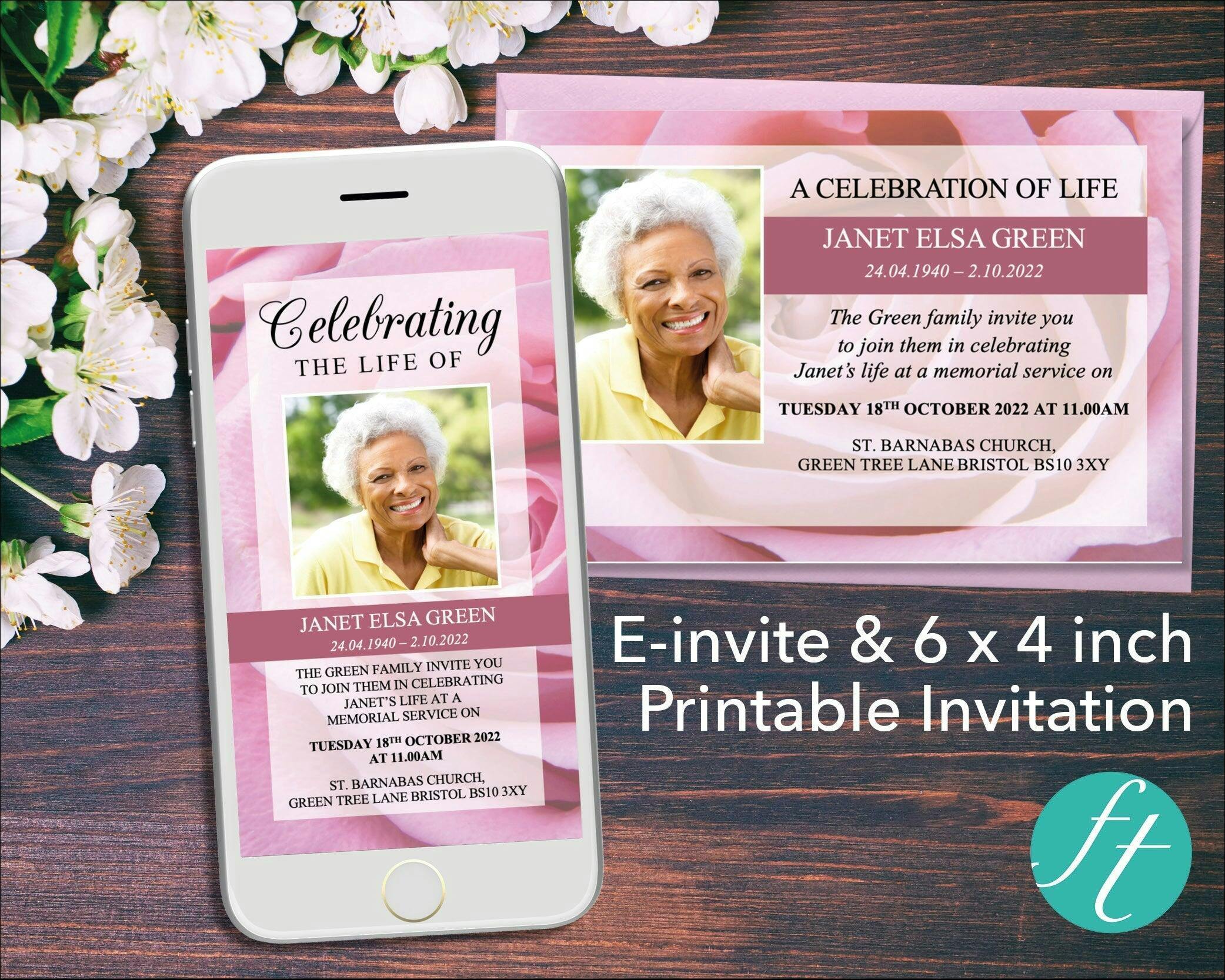 Electronic Funeral Invitation (e-Invite) plus printable 6 x 4-inch Funeral Invitation Card with a vibrant pink rose background. Invite your funeral guests via email, SMS, WhatsApp or social media with a digital invitation. Or print, trim and send a traditional invitation card in the post. Both templates are easy to download and edit in Microsoft PowerPoint. Includes space to add a photo plus information about the date and location of the funeral service.